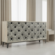 Contemporary and chic, this entertainment center combines natural materials and a classic black and white color scheme and shell motif to create a functional focal point. Crafted of Mango Wood with bone inlay, a natural wood finish on the outside of the case contrasts with black and white inlay on the door fronts and is complemented by a gray metal base and hardware and an off-white painted interior. There’s one removable shelf behind each door, a 3-plug electrical outlet, ventilated back panel and soft-close hinges on the doors.