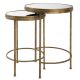 Set of two iron nesting tables, finished in an antique brushed gold. The top of each table is finished with a plain mirror. Sizes: Medium table: 14.875"W x 14.875"D x 21"H; Large table: 17.875"W x 17.875"D x 24"H.