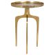 The unique design of this accent table features three curved legs and a solid round top, which is accented with a .75" raised lip. This cast aluminum table is finished in a slightly textured soft gold. Perfect beside your favorite chair! Also available in