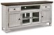 Havalance TV StandHave your fill of modern farmhouse style with the Havalance TV stand. Its distressed two-tone finish pairs a vintage white with a weathered gray for a look that’s utterly charming. Right and left cabinets open to reveal adjustable shelving for all your entertainment center storage needs. Center glass doors add to its relaxed appeal.