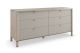 Light tones and organic textures in perfect balance exude a refined modern elegance. Soft-to-touch, vinyl wrapped drawers are complemented by Silver Platano wood veneers and a polished travertine stone top. Metal accents and a base in Lucent Bronze add warmth and subtle contrast to its calming, clean-lined form.
