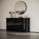 Bold and sophisticated, the Overlap Dresser Dark epitomizes modern luxury. Its sleek Piano Black finish gracefully adorns the top and drawer fronts, harmonizing seamlessly with striking Nero Marquina side panels. Accentuated by delicate metal trim in Whisper of Gold, this dresser adds a refined shimmer to your decor. Featuring six spacious drawers with interiors matching the elegant exterior finish, this dresser offers practicality wrapped in an alluring contemporary aestheticùperfect for elevating any bedroom space.Dimensions (cm):