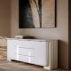 The Overlap Sideboard Light features a top finished in Latte Gloss, and striking stone side panels crafted from unfilled Travertine, marrying refined elegance with functionality.