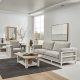 This two-tone cocktail table provides a beautiful centerpiece to any living space, as well as plenty of surface area from its 56? top and lower shelf for both display and entertaining. A light, airy white base supports the warm-toned veneer top, representing a blend of vintage-inspired farmhouse style with laidback modern charm.