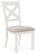 Fabric;Wood Products and Other, Dining UPH Side Chair (2/CN), Light, Made with solid wood frame;Antiqued white finish with grain texture;Light gray polyester upholstery;Nailhead trim;X-back;Assembly required