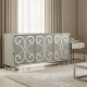 Create a luxe atmosphere with this glamorous buffet with dual-function capability as an entertainment center to accommodate up to a 75-inch TV. Crafted of Poplar and Hardwood Solids, it is adorned with the Epoque finish, a greige with shimmer on Oak veneers. Three doors with touch latches have one adjustable shelf behind each door.