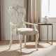 Ready for a candlelit dinner, these romantic, elegant arm chairs are enticing with shaped fretwork backs and cabriole legs. The Blanc creamy white finish is accented with champagne and silver tipping. The Glitter Pearl upholstered seat is a performance fabric for stain resistance and easy cleanability.