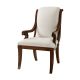 A mahogany armchair, the overscroll padded back and seat between open scroll arms and above floral capital carved and panelled sabre legs. Inspired by a 19th century French original.