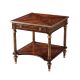 A mahogany and gilt lamp table, the square brass bound top with a frieze drawer, on turned fluted legs, concave front undertier and peg feet.