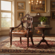 A hand carved mahogany library armchair, the back in the shape of a ship's transom carved with a Coat of Arms centred by the Spencer crest flanked by Victory wreaths.