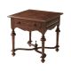 An antiqued wood lamp table, the square parquetry top above a drawer and bell turned legs joined by a serpentine 'X' stretcher. The original William and Mary.