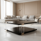 Instantly elevating, this square cocktail table brings a beautiful balance of linear forms and light. Its Tuxedo Black tabletop and shelf appear to float within clear acrylic posts, for a look that stirs interest, without imposing. Whisper of Gold metal accents create shimmer and moments for reflection. Centers a room, and offers ample space to style books and decor, above and beneath.