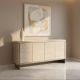 The Mohave Desert is known for its great mesas, dry river beds, mountain ranges and towering sand dunes. This buffet combines the best mix of materials that are emblematic of the warm desert. Bullnose corners throughout create flowing curves on this rectangular console. Sundrenched Oak top, sides and base. Contrasting with the top, the doors display textured unfilled Travertine. Thin, metal Whisper of Gold Bands gleam like the sun around the top and door trims. An Almond Milk interior features four adjustable shelves and wire management holes. This substantial piece rests on very thin, Whisper of Gold blade legs.