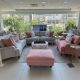 Contemporary styling sofa set outlined by stainless accent strips and white platinum toned upholstery.