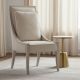 Exuding a feeling of comfort and simplicity, the Elixir Host Chair will help you extend gracious hospitality in your home. With a fabric seat and fully upholstered back in a lovely neutral color, the wood finish is in a serene gray beige applied to lightly sand-blasted walnut veneer for a textured look. A loose-pillow back adds extra comfort, and the splayed front legs add extra flair. Elixir is a casual contemporary collection that, like its name implies, exudes a feeling of comfort, simplicity and well-being. While Elixir has crisp, clean lines, character and visual interest are also achieved through the use of texture. Textural interest comes from the use of lightly sand-blasted walnut veneer, light texture applied to the metal elements along with a hand-carved texture added to the surface of select pieces such as the oval mirror and the round dining table. The buffet offers a beautiful carved starburst pattern on the doors.