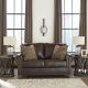 Enticing with a coffee brown faux leather, beautified with a gently weathered effect and designer stitching, the Nicorvo loveseat merges a richly traditional sense of style with modern comfort. Roll arms, turned bun feet and prominent nailhead trim incorporate distinctive character. Pair of jacquard-patterned pillows are a sumptuous touch.