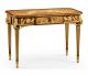 A tour-de-force of cabinetry, a superbly detailed satinwood and exotic wood inlaid writing table with designs of the sciences and putti raised on finely carved tapering gilt legs set on lotus leaf feet. The small drawer opens for storage, but a further lock opens a secret larger drawer with hidden storage and a hinged panel to support a book. Fully lined interior with further inlays, and abundant applied rococo cast brass detail. The original design was made by Beurdeley in early 19th century. (Old salescode: 494535)