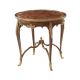 A fine and delicate mahogany and gilt accent table, the brass bound mother of pearl inlaid and line strung flame veneered top above an undulating hand carved acanthus scroll apron, on slender cabriole legs with fine brass mounts abd sabots, joined by moulded arched stretchers with a brass finial centre.