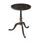 An ebonised, gilt and painted circular lamp table, with brass bound top and turned column, on tripod cabriole legs. The original Victorian after Jennings and Betteridge.