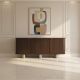 Enhance your space with the sophisticated presence of this credenza and let its intriguing design elevate your d?cor. The unique, handcrafted walnut finish is softened by gently rounded corners framing four sleek doors. Elegant metal handles, with a touch of antique brass, add a subtle yet refined detail. The unique, sculptural metal base provides a modern, floating effect. The clean lines and substantial form offer both storage and style, ensuring this credenza complements its surroundings with its quiet drama. Whether placed in a dining room, living area, or hallway, this credenza is sure to reflect well on its surroundings, offering both functionality and a touch of contemporary eleganceProduct Dimensions (cm):
